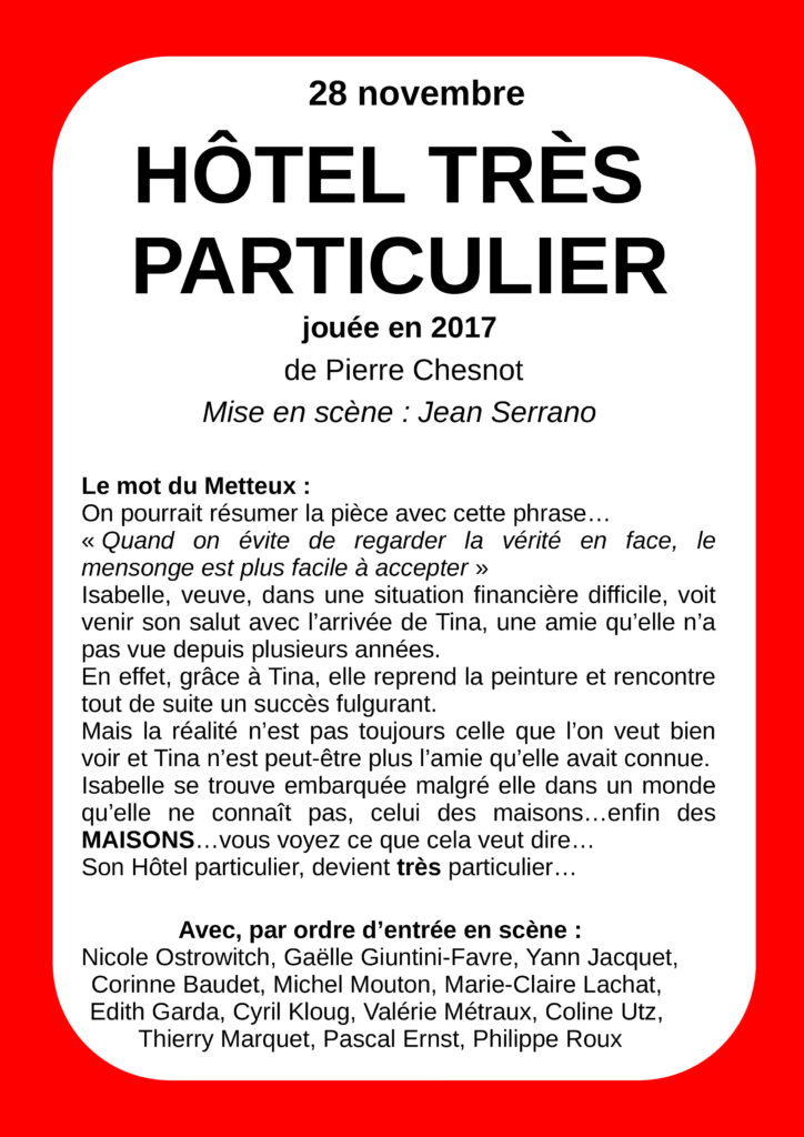 Le boulevard triomphe lors du 10e Festival de Théâtre de Chisaz! Dimanche soir 7 octobre, le 10eFestival de Théâtre de Chisaz s’est achevé avec la cérémonie de remise des prix qui a vu le triomphe de la troupe Perly sur Scène (GE) et de son spectacle Pension complète de Pierre Chesnot. La compagnie genevoise a Lire plus ...
